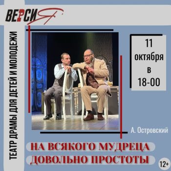 В субботу, 11 октября, в 18-00, спектакль «НА ВСЯКОГО МУДРЕЦА ДОВОЛЬНО ПРОСТОТЫ». Егор Дмитрич Глумов молод, честолюбив, амбициозен, умен и… […]